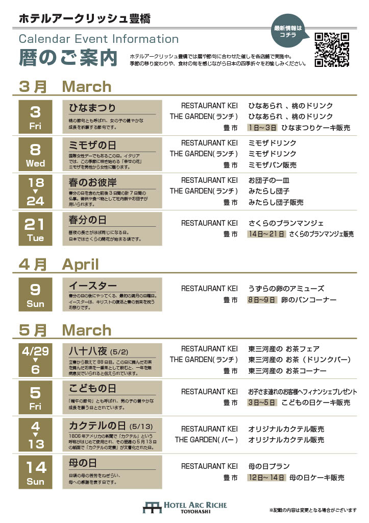 ホテルアークリッシュ豊橋では、暦や節句に合わせた催しを各店舗で実施いたします。