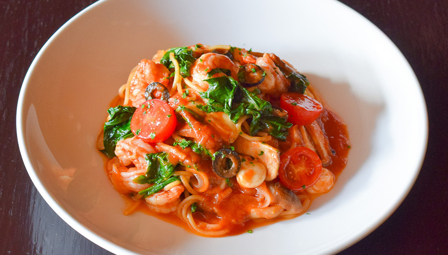 蒲郡漁港ガスエビとモッツァレラチーズのトマトパスタ