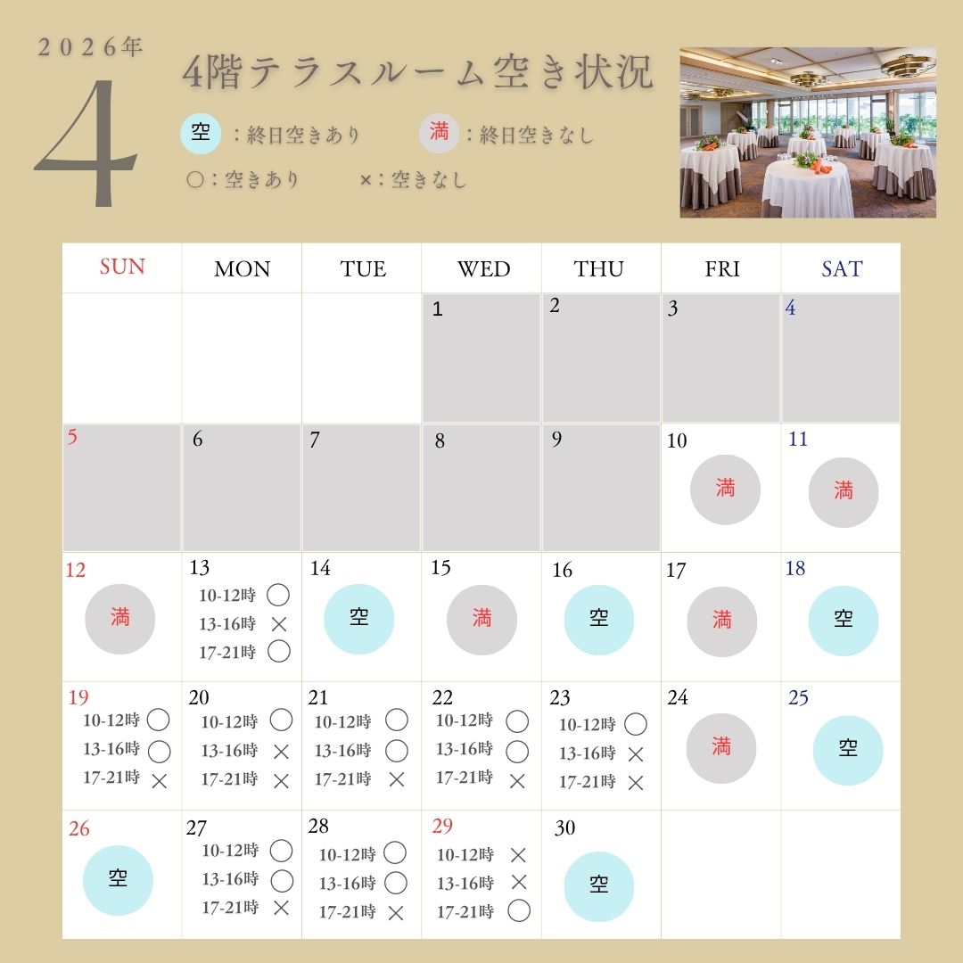 ※3/27現在の空き状況となっております。ご希望日程の正確な空き状況はお問い合わせください。